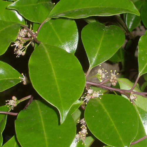 葉は、互生(互い違いにつく)で、革質で厚く、楕円型で長さ6〜10cmほど、幅3〜4cmほどのものまでいろいろあり、葉先は鋭三角形状です。