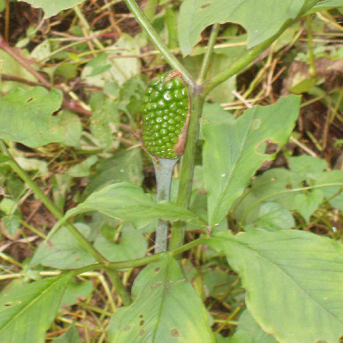 また、マムシグサ、ウラシマソウやミミガタテンナンショウとは大きく異なり、葉が三出複葉です。